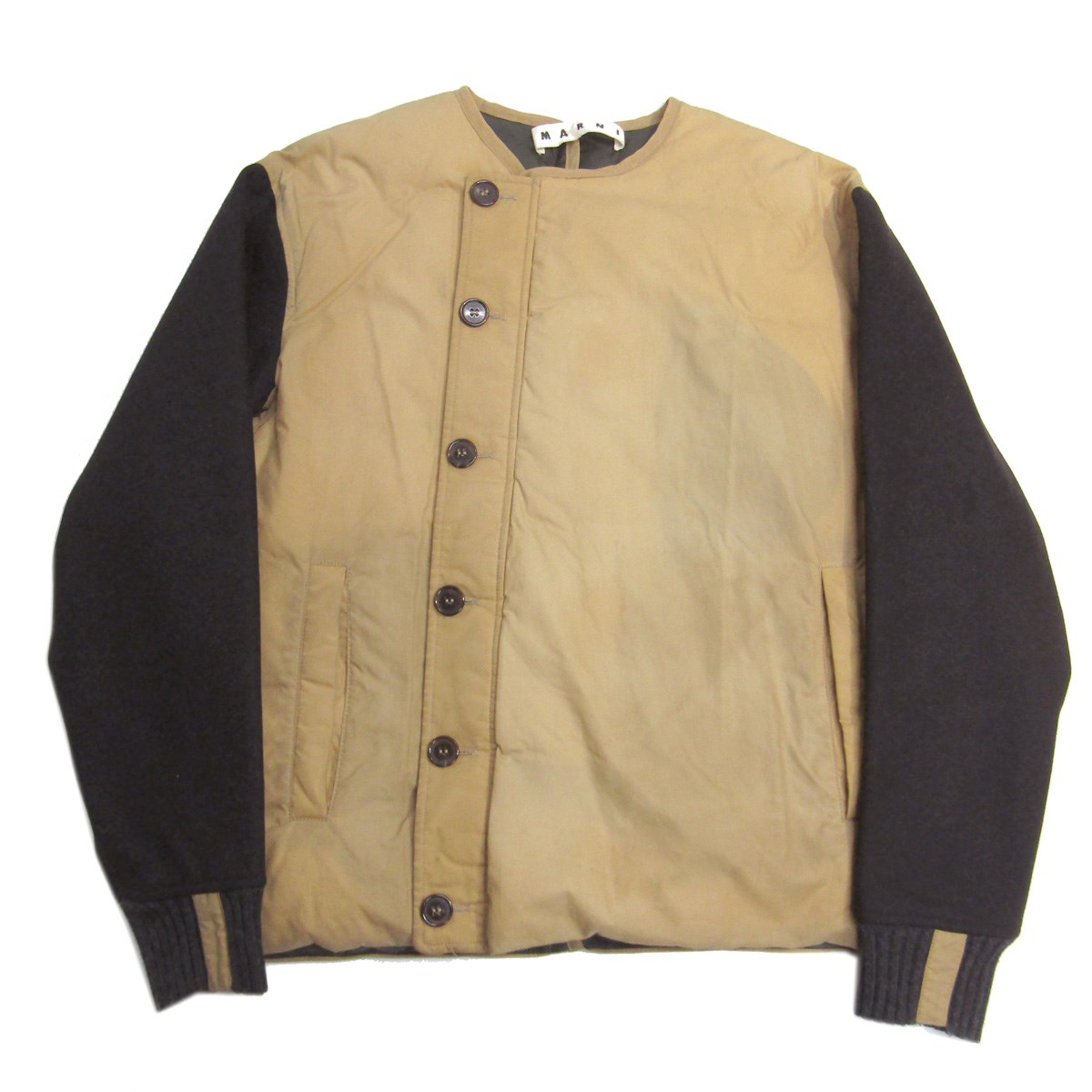 マルニの2015AW ウール切替 アシンメトリーボタン ノーカラーダウンジャケットです。マットな質感で丸みを帯びたシルエットが特徴です。MARNIは形式にとらわれない自由な発想と、素材や色使いに対する実験的なアプローチ、そしてプリントやフォルムの組み合わせ方に表れる独自のセンスを特徴に、世界中で多くのファンを抱えています。