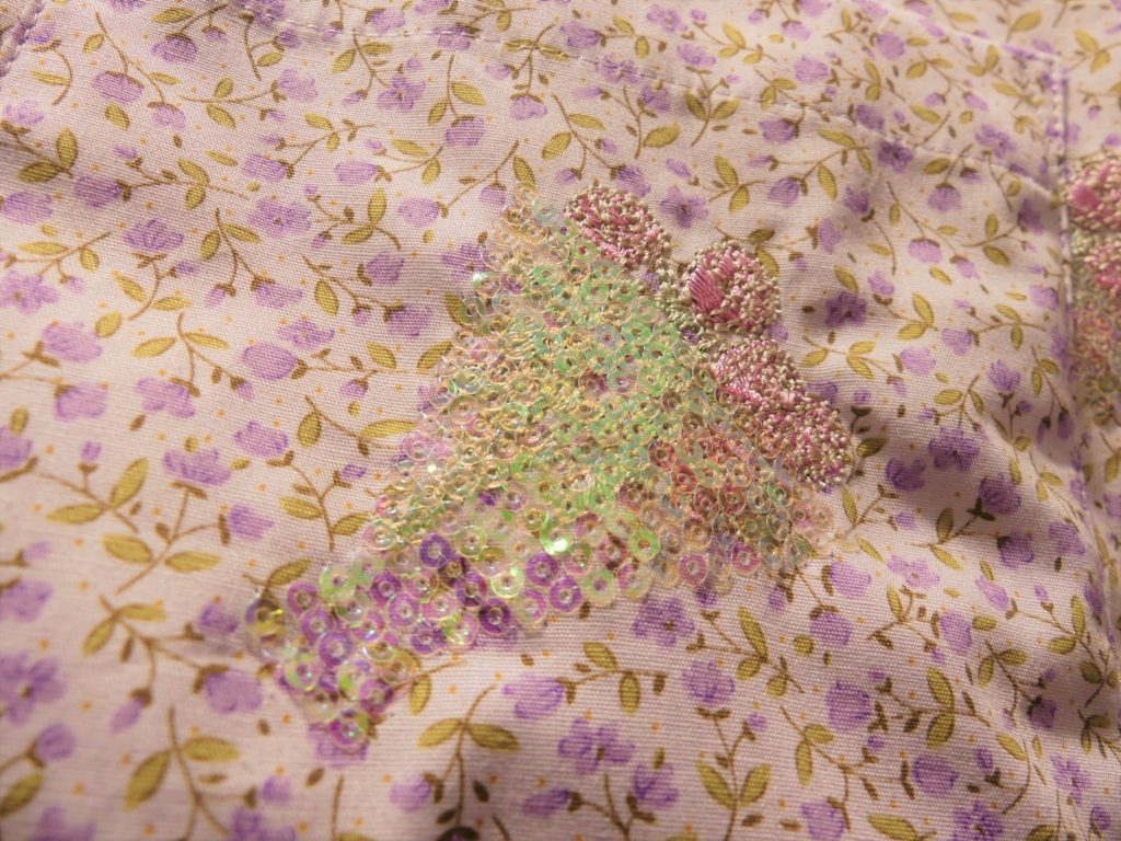 ちらほらとお花の刺繍が施され、その上から透明オーロラスパンコールが