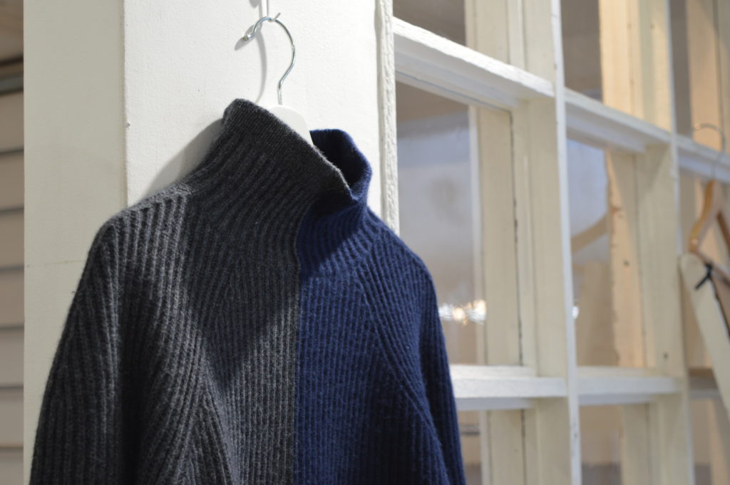 ネイビーとダークグレーの触り心地の良い糸で編み込まれた一着です。