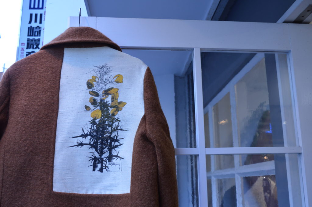 背中に大きくあしらわれた水彩画が特徴的なPコート。