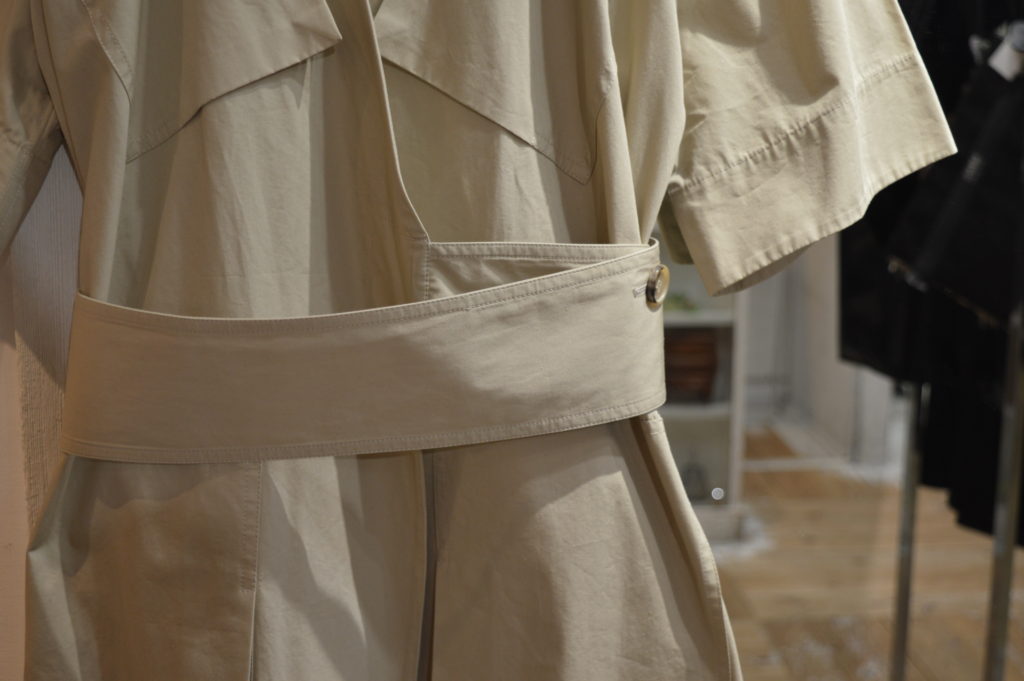 腰元の調節可能なベルトが印象的なデザインの一着。