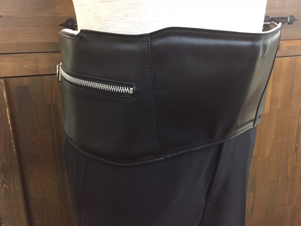 こちらは珍しい、カマーバンドをイメージして作られたレザーウエストバッグです。