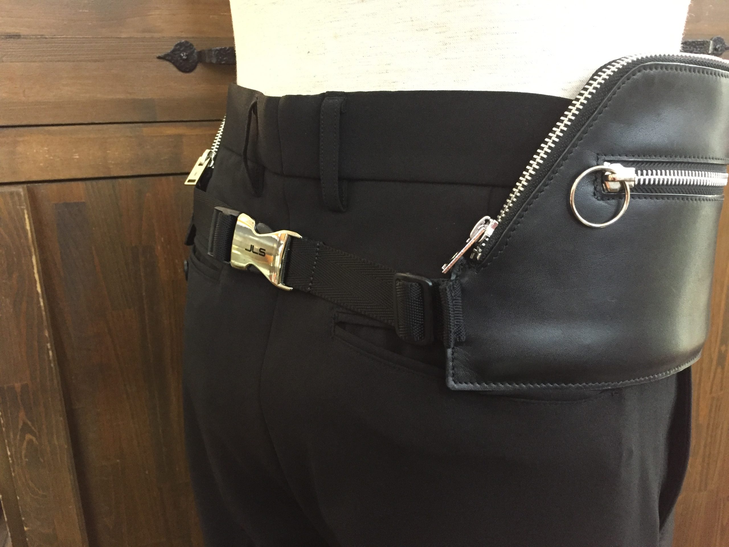 フォーマル感のあるアイテムをウエストバッグにしてしまう、遊び心のある一点。