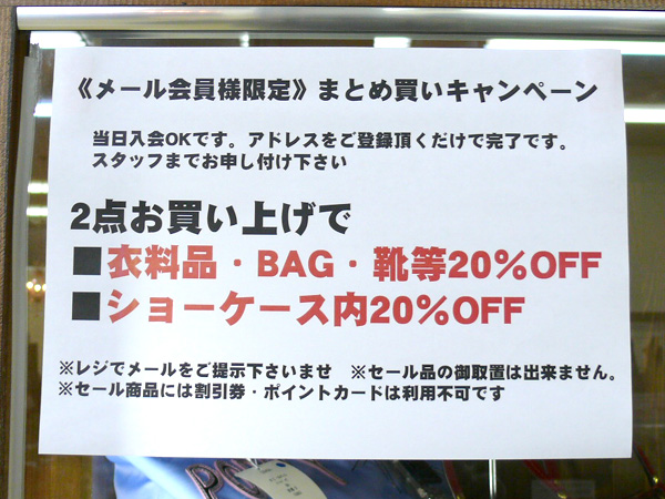 ☆お得な情報☆ 投稿日: 2012年10月23日 作成者: katata こんにちは。 只今、堅田店では まとめ買いキャンペーンを開催中です。 2点買って、20%OFFなので かなりのお得なイベントです。 しかも!衣料・小物に関しては対象外がありません!! びっくりですね!! メール会員様限定ですが、当日入会もOKなので お気軽にスタッフまでお問合せ下さいませ。 さらにもう一つお知らせがあります。 本日から店内商品を100点ほど値下げ致しました。 目玉商品はコーナーも作っています。 前から気になっている商品があるかもしれません。 是非、ご来店下さいませ。 TOP 電話