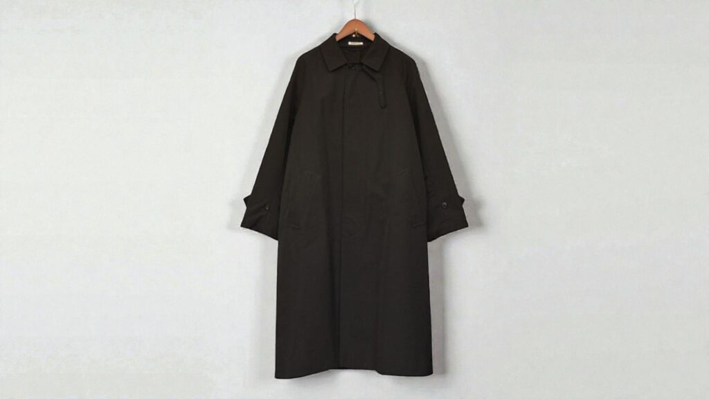 デザインは極めてミニマルで、装飾を排したステンカラー仕様が特徴です。肩や身幅には適度なゆとりを持たせ、着用時には直線的で端正なシルエットを描きます。