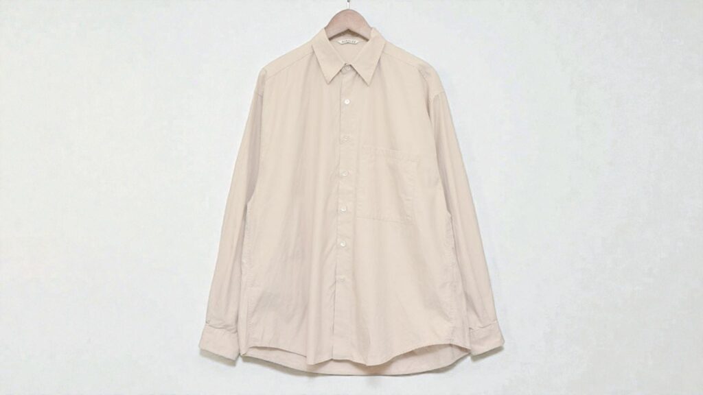 このアイテムは、ブランドの素材哲学が最も端的に表れた一着です。台衿と一体化した衿型は、クラシックなシャツの構造を踏襲しながらも、