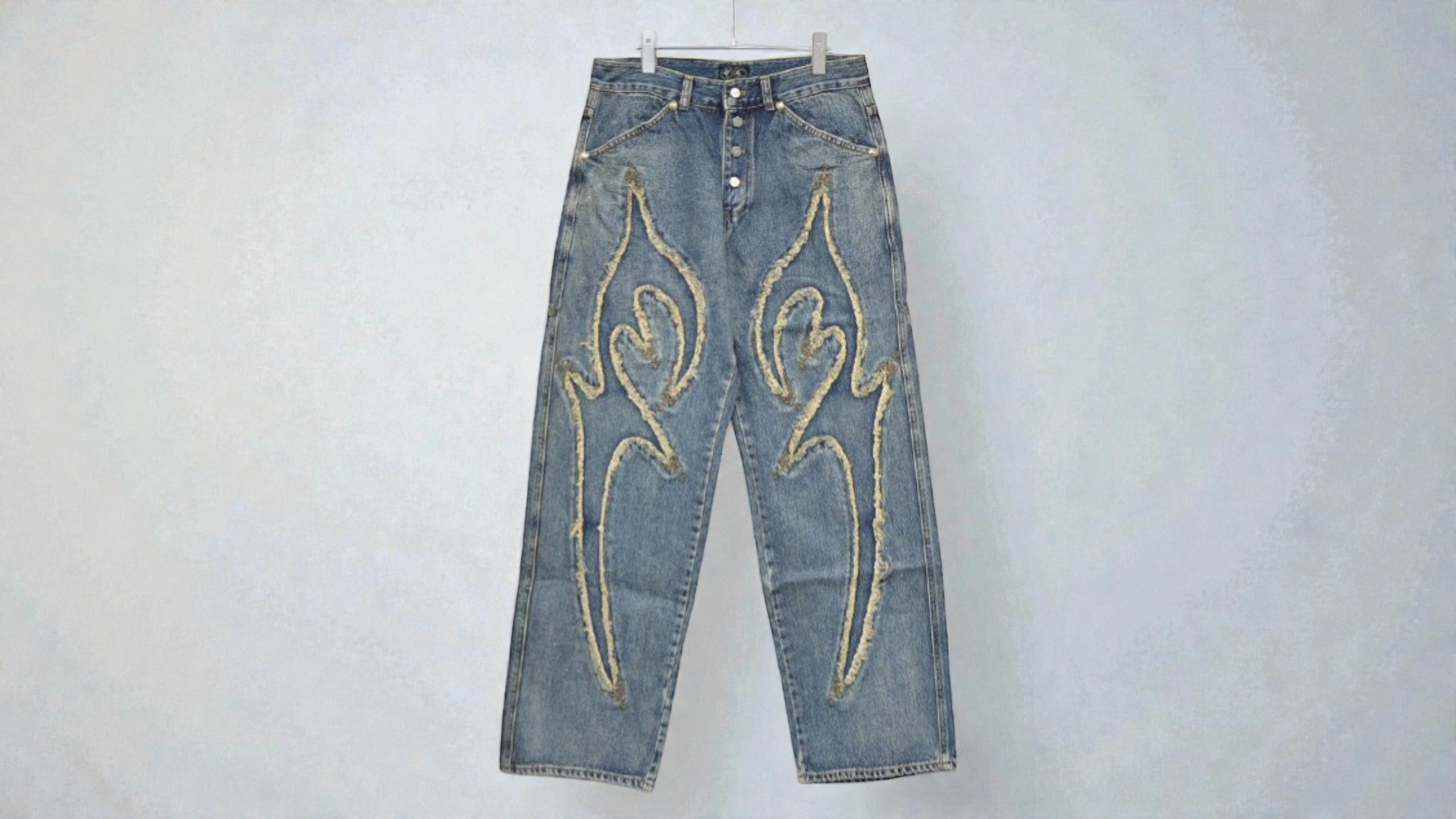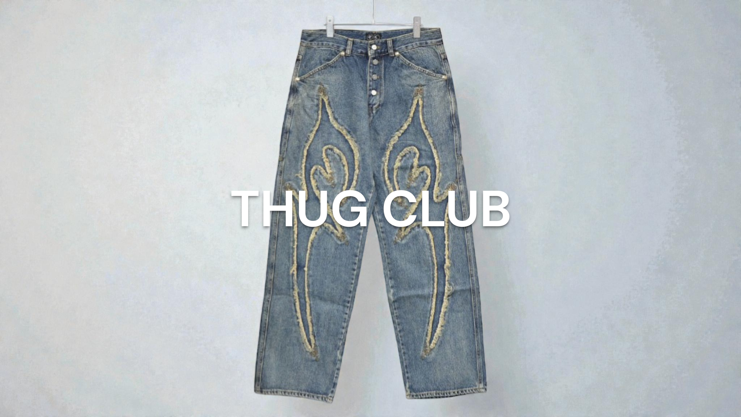 THUG CLUB特有のハードな世界観を際立たせています。素材にはウォッシュ加工を施したミディアムオンスデニムを使用。