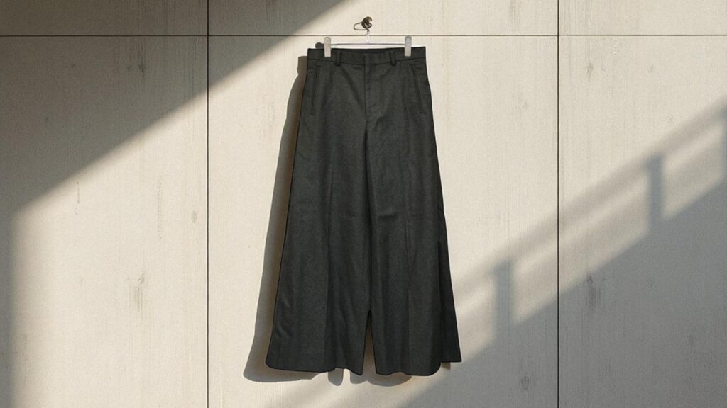 これにより通常のワイドパンツにはない独特の立体感と動きが生まれ、
