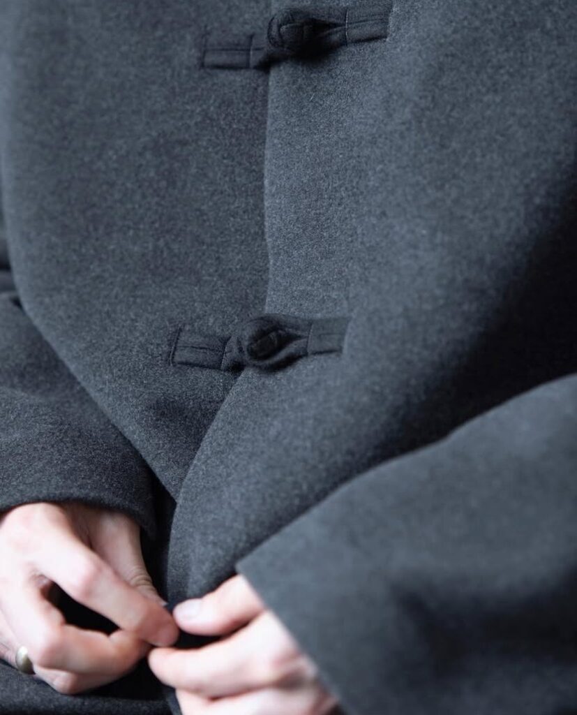 フロントに並ぶチャイナボタンが印象的です。伝統的なディテールを踏襲しながらも、