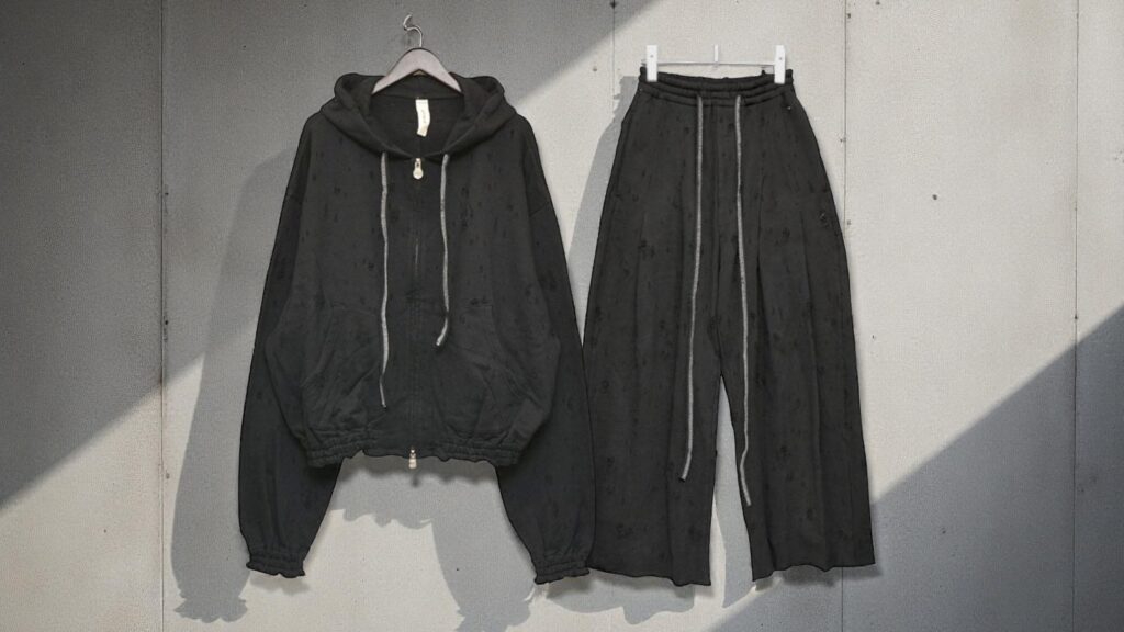着る人の生活や時間の流れに寄り添うような温かみを感じさせます。無骨さの中に繊細な美しさが宿るこのセットアップは、