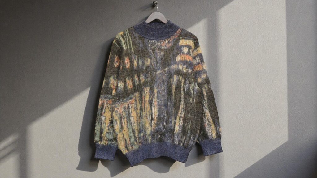まさに“編みの絵画”と呼ぶにふさわしい一着です。デザイナー本人が語るように、「夜の風景とモヘアはマスカットとチーズのように相性が良い」という感覚の通り、