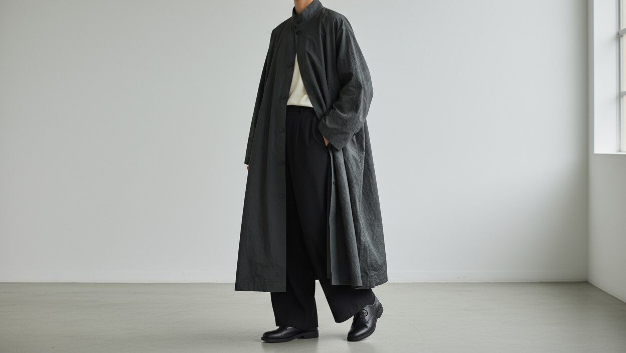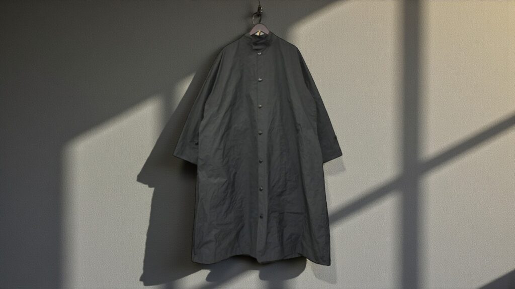 着る人の個性を際立たせながらも、決して主張しすぎないバランス感覚が見事です。素材には“paper cloth”と呼ばれる独特の質感を持つファブリックを使用。