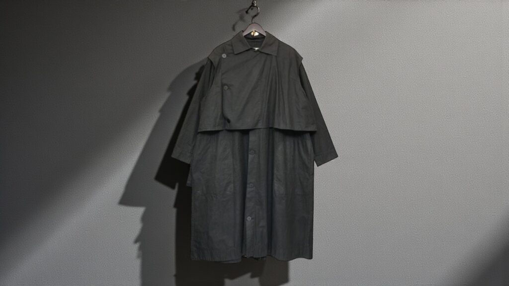 ミニマルで洗練されたデザインへと昇華させています。まず目を引くのは、雨よけのように重なる比翼仕立て。