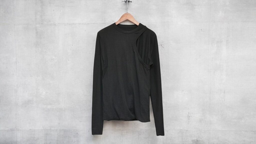 意図的に崩された左右非対称の構造は、従来の「整った衣服」という概念から距離を取り、