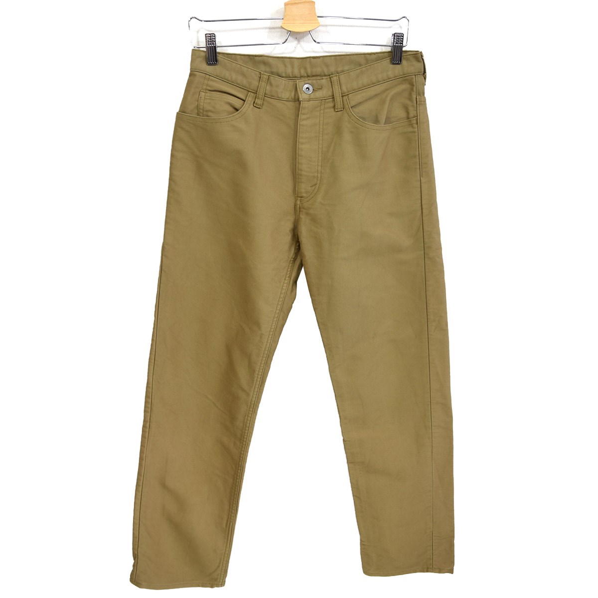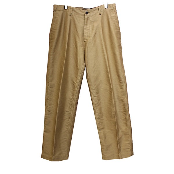 2項目目同様エジプトの超長綿であるフィンクスコットンを贅沢に使用したパンツ。しっかりと打ち込んで畝を出して織り上げた高密度のモールスキン生地をあえて起毛加工を施さずに使っています。ハリがありながらも柔らかく、やや光沢があるのも原料と織りの良さによるもので、洗えば洗うほど柔らかく風合いが増すパンツです。ウエストはアジャスターが付き、シルエットがかなり太めなのが特徴です。